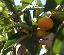 | 柿の花は雌雄が分かれており、左が雄花、右が雌花です。 雄花は小さくかたまって咲き、雌花は大きく単体で咲きます。 花は薄緑色で、香りはほとんどしません。 | 1箇所に沢山の味がなると、実が小さくなり美味しくありません。果実の数を制限することにより、1つの果実により多くの栄養がいき届くよう、枝に2~3個になるよう調整します。 | 1つ1つ丁寧に傷がつかないよう、気をつけて収穫します。 |
